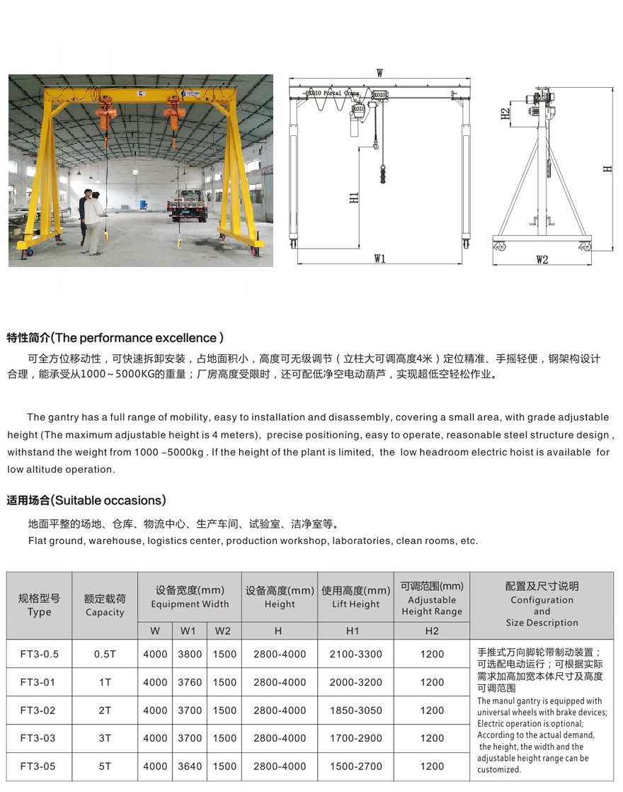 輕型龍門(mén)架起重機(jī)是我公司根據(jù)大、中、小工廠(chǎng)(公司)日常生產(chǎn)需要搬運(yùn)設(shè)備、倉(cāng)庫(kù)進(jìn)出貨,起吊維修重型設(shè)備及材料運(yùn)輸?shù)男枰?/span>設(shè)計(jì)生產(chǎn)的一款輕小型起重設(shè)備主要用于車(chē)間日常生產(chǎn)需要搬運(yùn)設(shè)備、倉(cāng)庫(kù)進(jìn)出貨,起吊維修重型設(shè)備及材料運(yùn)輸?shù)男枰?。?nèi)容:該移動(dòng)龍門(mén)架優(yōu)點(diǎn)是可多方位移動(dòng),可快速拆卸安裝,占地面積小,用微型汽車(chē)就可轉(zhuǎn)移到另一個(gè)場(chǎng)地安裝使用。