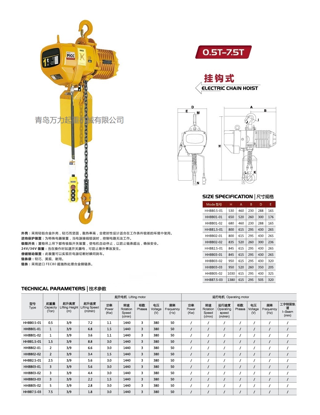 極限開關:吊上吊下都有開關裝置,使自動停止,防止鏈條超出,確保安全。